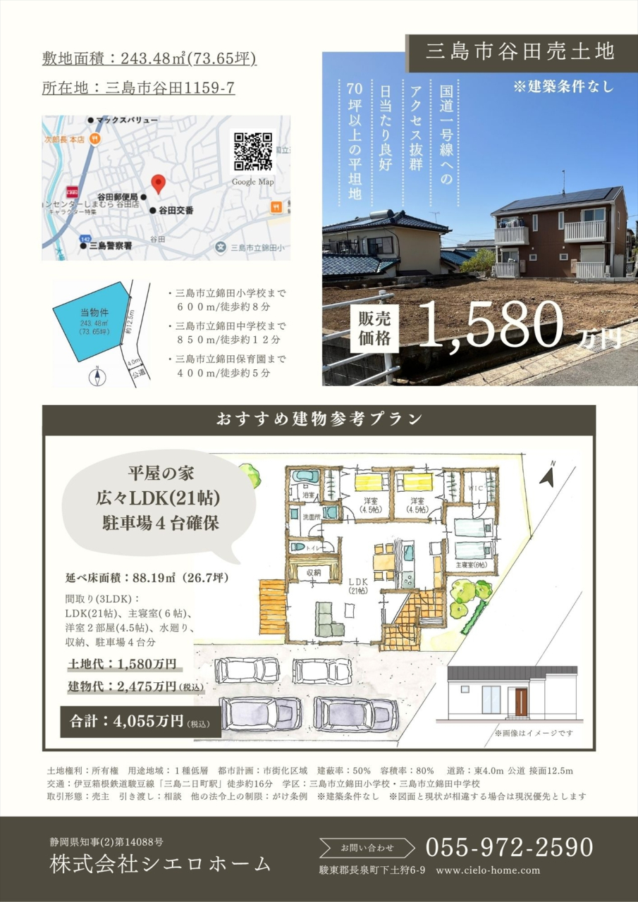 三島市谷田 売土地【建築条件なし】 閑静な住環境が魅力の三島市谷田に、理想の暮らしを叶えられる建築条件なしの売土地が登場しました。 ■ポテト錦田店まで徒歩約8分 ■国道一号線へのアクセス抜群 ■広々70坪以上の平坦地 ■三島市立錦田保育園まで徒歩約5分で、子育て世帯も安心 静かな住宅地にあり、日当たりも良好。 建築条件がないため、お好きな住宅メーカーで理想のお住まいを建てられます。