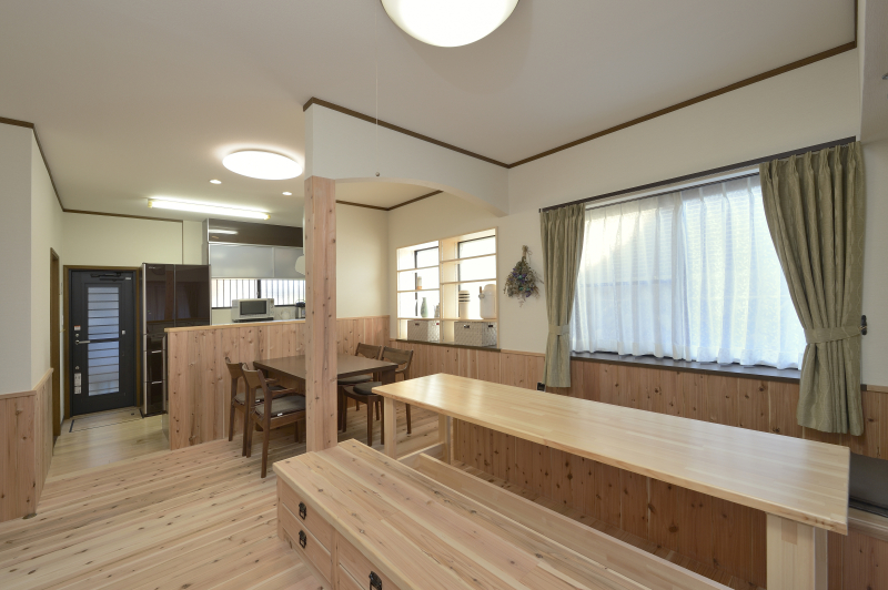 腰壁、テーブル・ベンチ椅子も無垢板で造作しました。